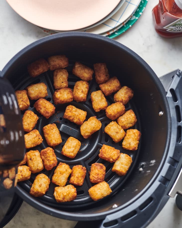 Place about 1/2 bag frozen tater tots in a single layer in the basket (they can be touching). Can you air fry frozen tater tots? No oil spray is needed. Air fry for 6 minutes. Apr 16, 2021 · heat an air fryer to 400°f.